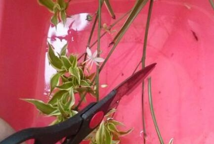 等到水盆中的小吊兰,长出一些根系之后,就可以将其修剪下来进行水培扦插了。修剪的时候要注意别把新生的根系弄伤,剪下来之后,可以适当的疏剪一下吊兰小植株上过密的叶子。